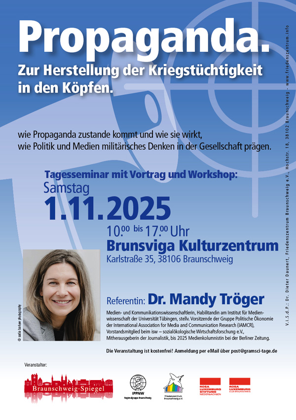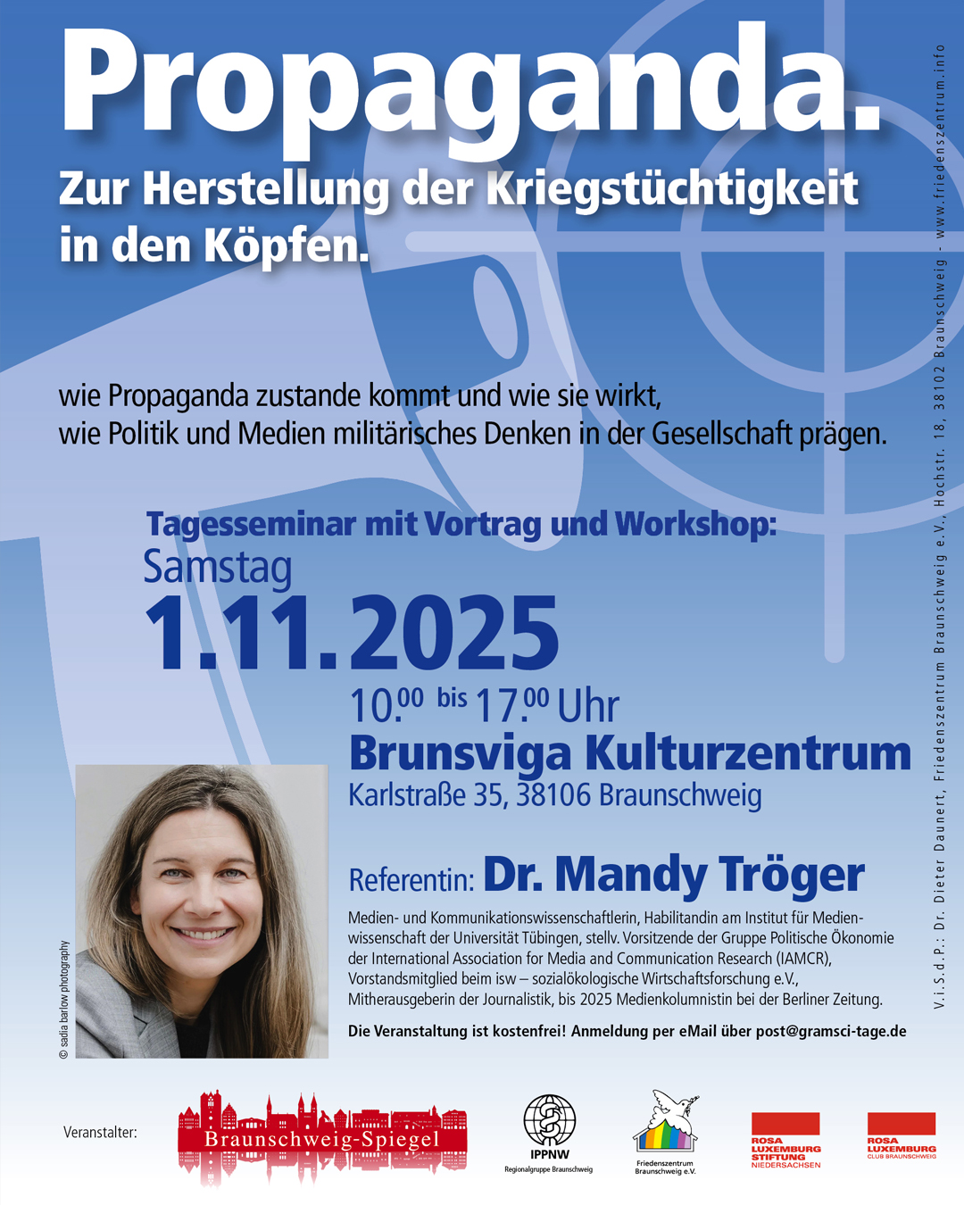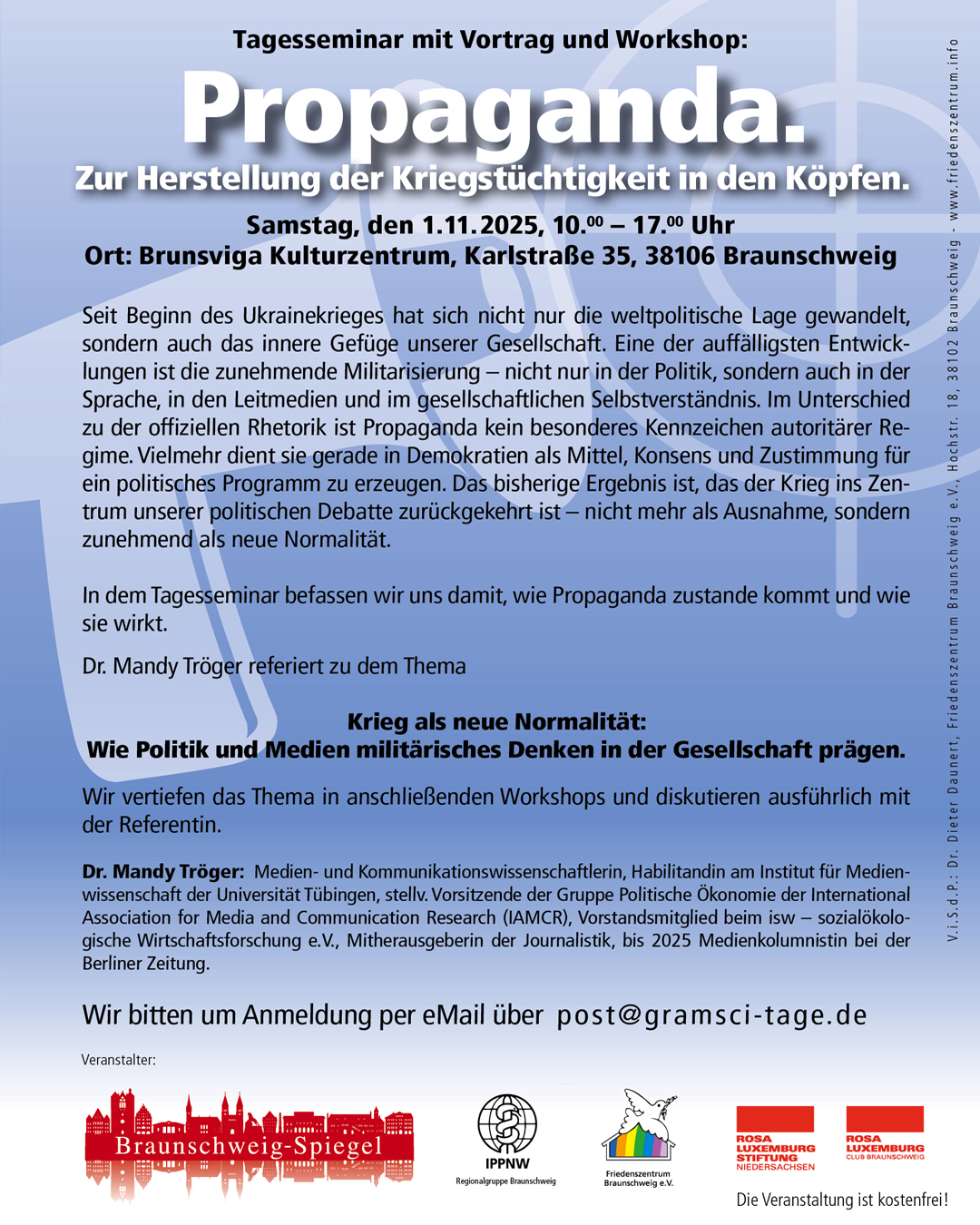 Seit Beginn des Ukrainekrieges hat sich nicht nur die weltpolitische Lage gewandelt, sondern auch das innere Gefüge unserer Gesellschaft. Eine der auffälligsten Entwicklungen ist die zunehmende Militarisierung – nicht nur in der Politik, sondern auch in der Sprache, in den Leitmedien und im gesellschaftlichen Selbstverständnis. Im Unterschied zu der offiziellen Rhetorik ist Propaganda kein besonderes Kennzeichen autoritärer Regime. Vielmehr dient sie gerade in Demokratien als Mittel, Konsens und Zustimmung für ein politisches Programm zu erzeugen. Das bisherige Ergebnis ist, das der Krieg ins Zentrum unserer politischen Debatte zurückgekehrt ist – nicht mehr als Ausnahme, sondern zunehmend als neue Normalität.