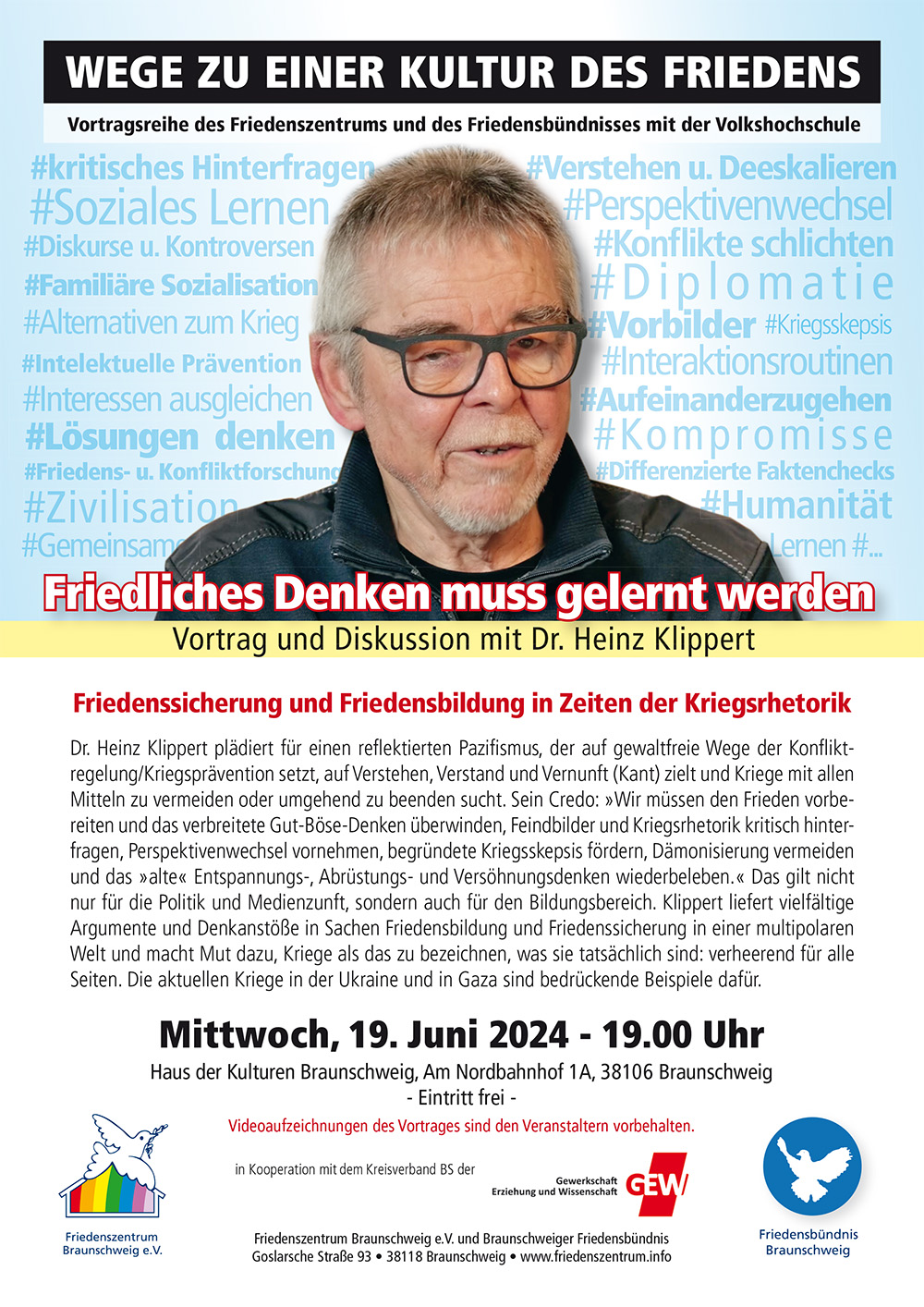 In seinem Vortrag plädiert Klippert für einen reflektierten Pazifismus, der auf gewaltfreie Wege der Konfliktregelung/Kriegsprävention setzt, auf Verstehen, Verstand und Vernunft (Kant) zielt und Kriege mit allen Mitteln zu vermeiden oder umgehend zu beenden sucht. Sein Credo: „Wir müssen den Frieden vorbereiten und das verbreitete Gut-Böse-Denken überwinden, Feindbilder und Kriegsrhetorik kritisch hinterfragen, Perspektivenwechsel vornehmen, begründete Kriegsskepsis fördern, Dämonisierung vermeiden und das „alte“ Entspannungs-, Abrüstungs- und Versöhnungsdenken wiederbeleben.“ Das gilt nicht nur für die Politik und Medienzunft, sondern auch für den Bildungsbereich. Klippert liefert vielfältige Argumente und Denkanstöße in Sachen Friedensbildung und Friedenssicherung in einer multipolaren Welt und macht Mut dazu, Kriege als das zu bezeichnen, was sie tatsächlich sind: verheerend für alle Seiten. Die aktuellen Kriege in der Ukraine und in Gaza sind bedrückende Beispiele dafür.